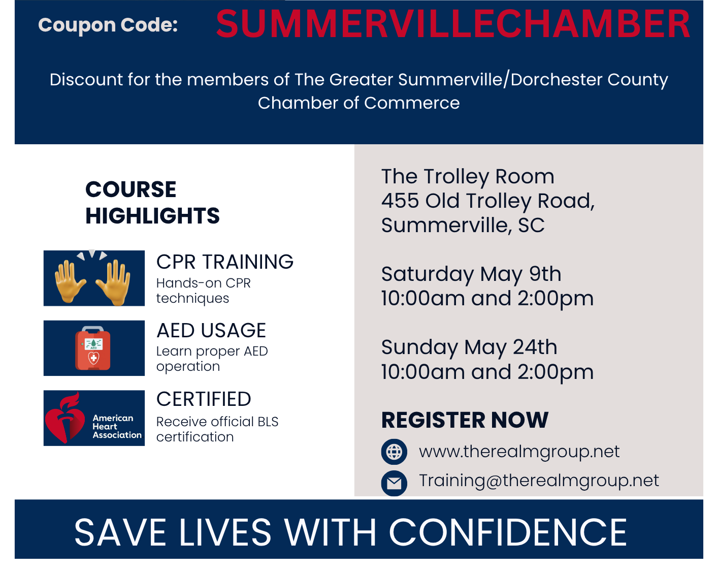 If you're looking to get certified in Basic Life Support (BLS) CPR in the Summerville area, now is the perfect time. The Realm Group is offering multiple BLS CPR classes this May at the convenient and well-known Trolley Room in Summerville, South Carolina.